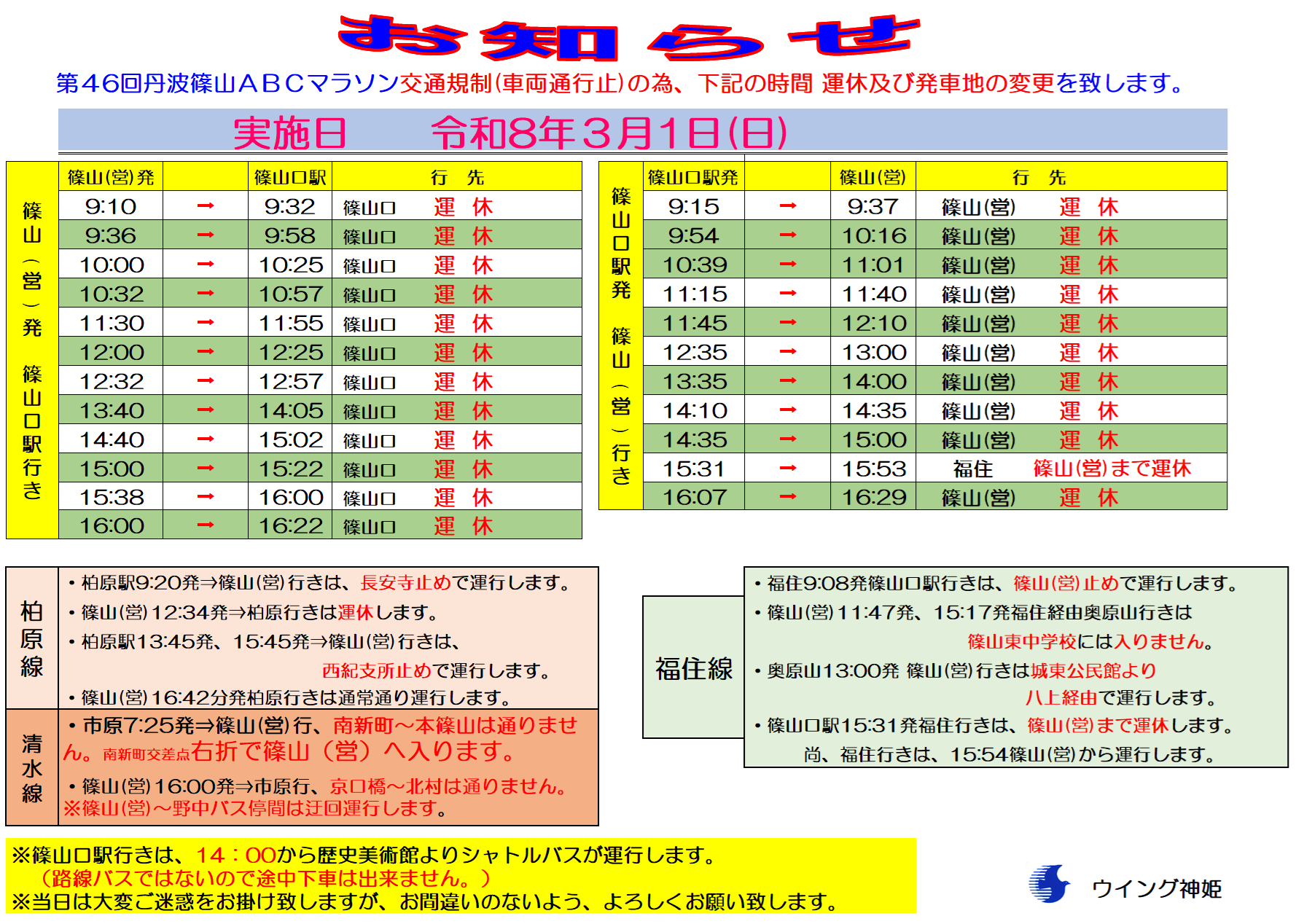 丹波篠山市内を運行するバスは下記の通りとなりますので、ご注意下さい。